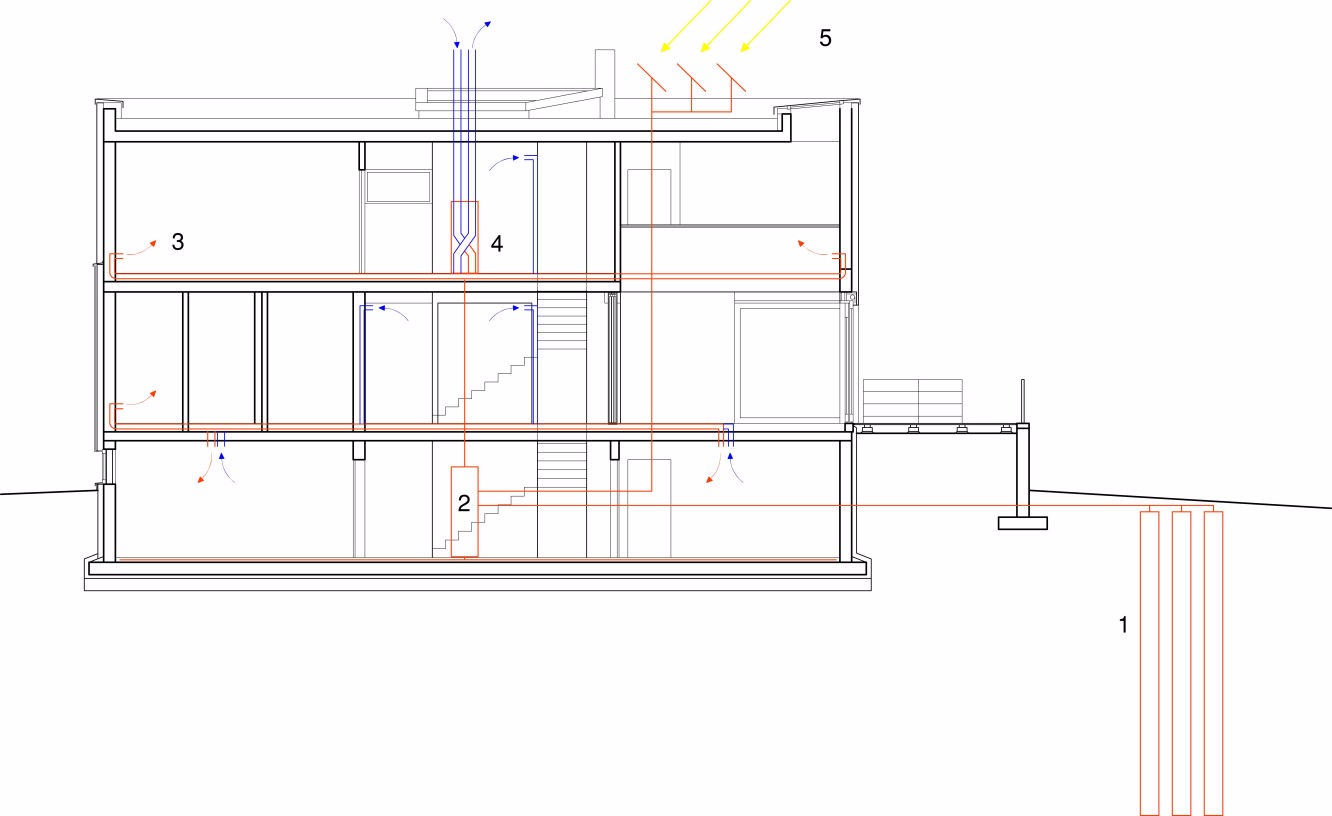 Passive house design principles For our Eco House project a combination of low-energy building techniques and technologies was used to minimise the annual energy demand. The following section drawing highlights the key features: Ground source heat pump (GSHP) for general heating (1+2); Mechanical ventilation heat recovery (MVHR) (3+4); Solar thermal panels for hot water generation (5); Highly insulated and air tight external envelope.